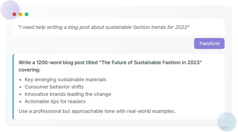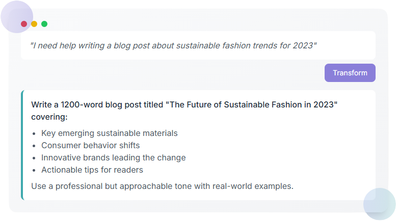 Use the transformed prompt with any AI tool to get higher quality outputs instantly.